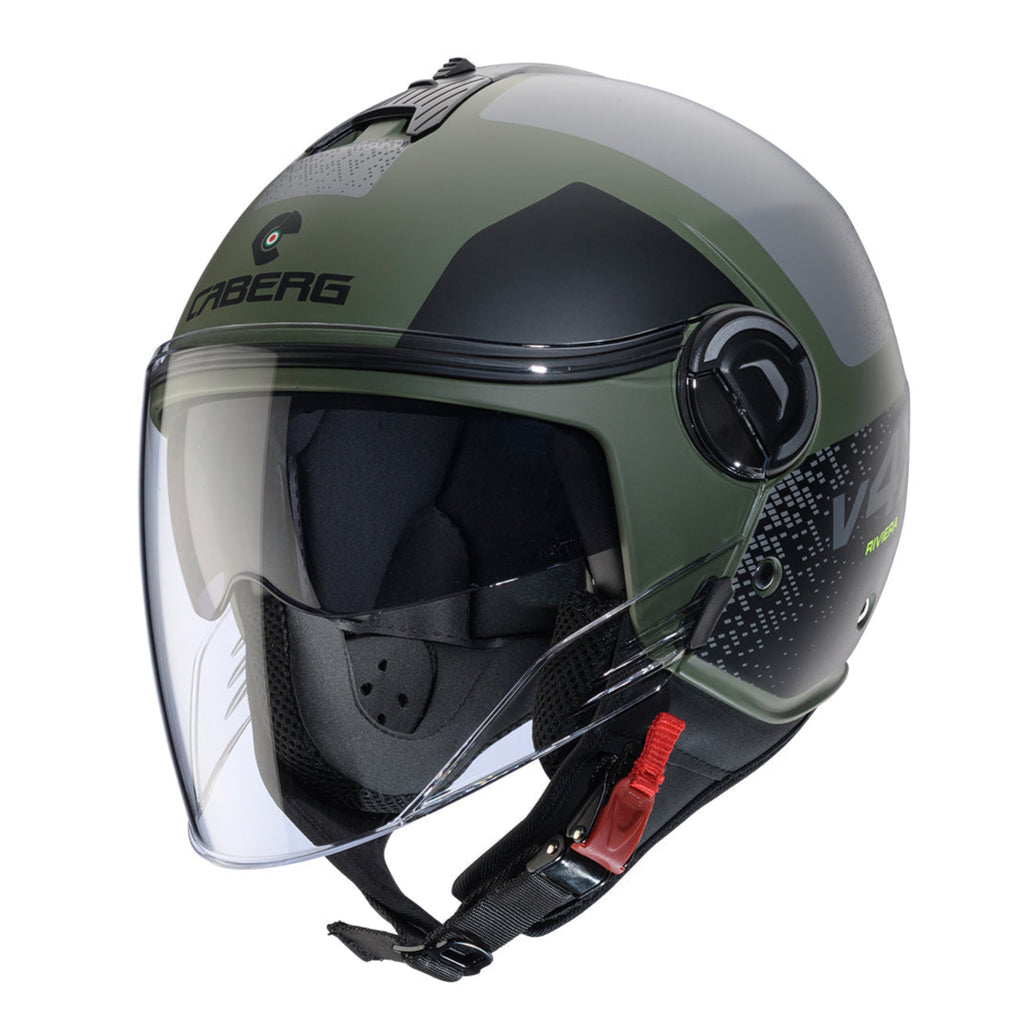 Order your Caberg Riviera V4X Alpha Matt Military Green / Black / Grey helmet today from Moto Central – the UK’s trusted retailer for Caberg helmets!