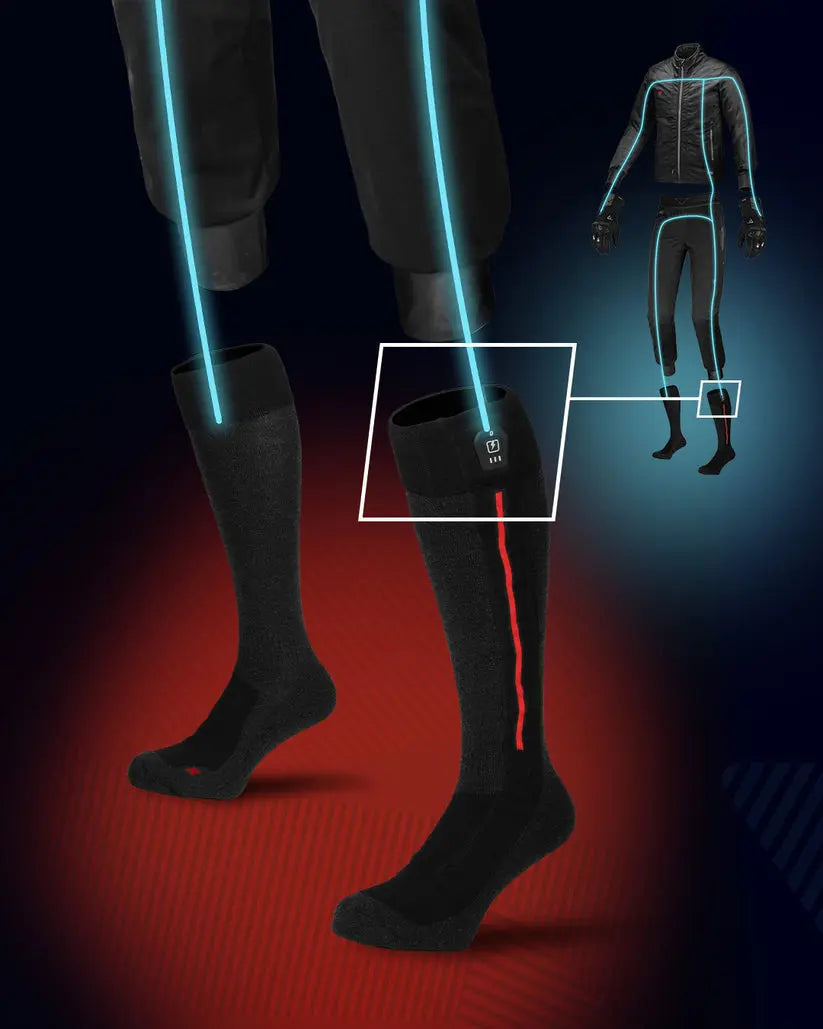 Electrically heated socks, developed for daily commuters and riders in cold conditions.