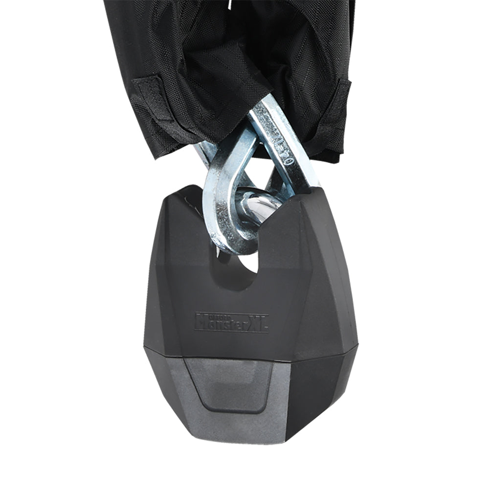 The Monster XL features a powerful 14.5mm chain made from high-quality Ni-Cro-Mo alloy steel, ensuring maximum durability and resistance against theft. The chain is protected by a cloth sleeve, which not only prevents damage but also makes it easier to handle. The ultra-strong padlock boasts a boron steel armour casing, a double locking mechanism, and a massive 16mm shackle, providing unparalleled security for your motorcycle.