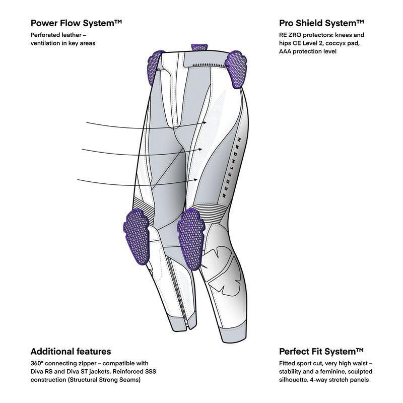 In summary, the Rebelhorn Diva Ladies Leather Trouser Black / White is designed for female riders who demand the highest level of protection and a sporty style that accentuates their curves. When paired with Diva jackets, they form a perfect, uncompromising set.